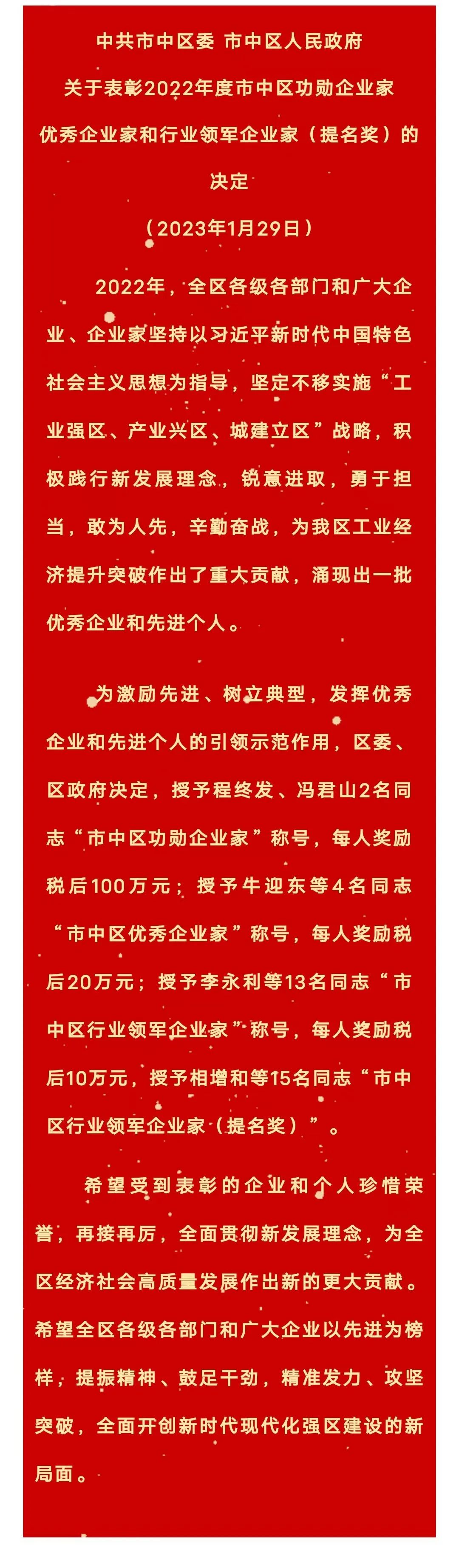 Decision on Commendation of outstanding entrepreneurs and industry leaders of meritorious entrepreneurs in Shizhong District in 2022 (nomination Award)