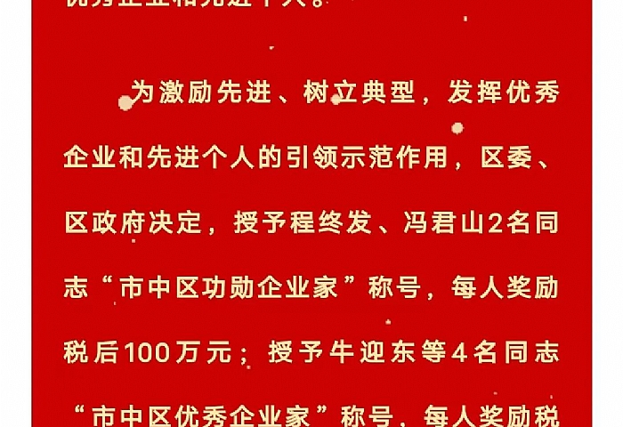 關(guān)于表彰2022年度市中區(qū)功勛企業(yè)家優(yōu)秀企業(yè)家和行業(yè)領(lǐng)軍企業(yè)家(提名獎(jiǎng))的決定