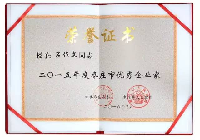 2016年3月31日下午,棗莊市工業(yè)和經(jīng)濟工作會議在市政大廈召開。市委、市人大、市政府、市政協(xié)主要領(lǐng)導(dǎo)同志出席會議并講話。會上,市委、市政府決定授予呂作文總經(jīng)理等我市15名企業(yè)家“棗莊市優(yōu)秀企業(yè)家”稱號。市委書記、市人大常委會主任李同道,市委副書記、市長李峰,市委副書記梁憲廷,市人大常委會第一副主任、市委秘書長孫欣亮等領(lǐng)導(dǎo)向優(yōu)秀企業(yè)家頒發(fā)了榮譽證書。
