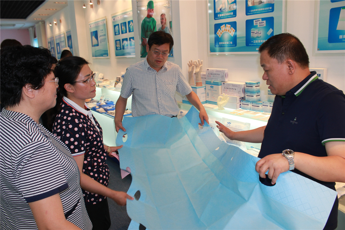 總經(jīng)理向邵局長(zhǎng)一行介紹公司專利產(chǎn)品:一次性使用床墊(滑移墊)