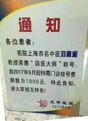 日前,上海中醫(yī)藥大學(xué)附屬龍華醫(yī)院的一則漲價(jià)通知在業(yè)屆流傳。通知表示,該院上海市名中醫(yī)劉嘉湘教授榮膺“國(guó)醫(yī)大師”稱號(hào),自2017年9月起,特需門診掛號(hào)費(fèi)調(diào)整為1000元。