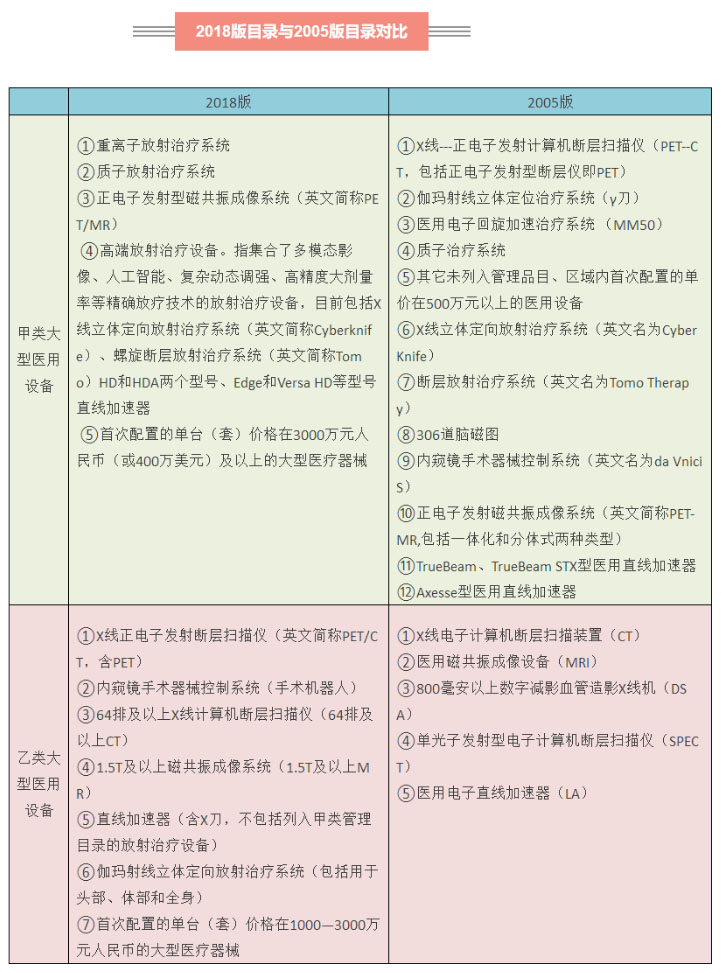與2005版目錄相比,2018版目錄中,甲類大型醫(yī)用設(shè)備的品目從12個(gè)減少到5個(gè),許多曾在2005版目錄中被劃為甲類大型醫(yī)用設(shè)備的品目,在2018版目錄中卻被劃為了乙類大型醫(yī)用設(shè)備。