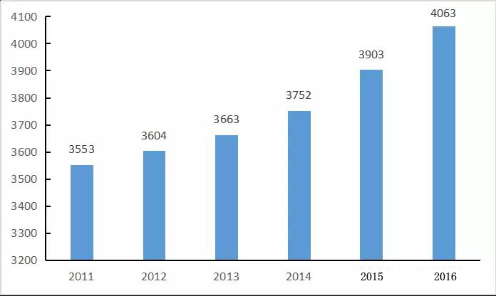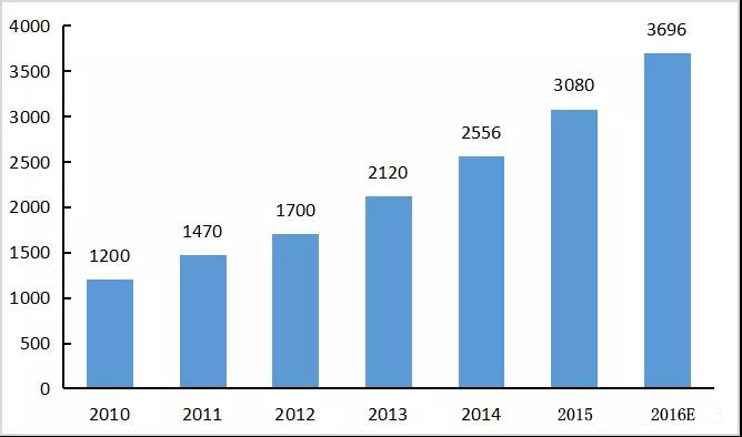 2011-2016年全球醫(yī)療器械銷售規(guī)模(億美元)
