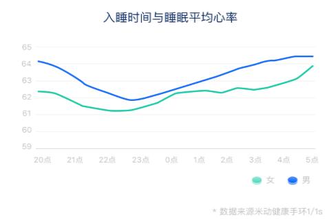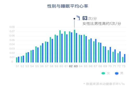 相關(guān)研究表明,睡眠平均心率一旦超過66次/分,心臟疾病風(fēng)險就顯著提高,需重點(diǎn)關(guān)注。大數(shù)據(jù)顯示,米動健康手環(huán)用戶的睡眠平均心率為63.26,整體均在健康范圍內(nèi)。其中,男性睡眠平均心率在62次/分人數(shù)最多,女性相較男性高約1次/分。