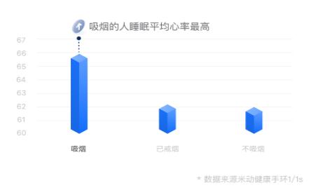 而對于吸煙人群來說,戒煙將會明顯改變心臟健康狀態(tài)。數(shù)據(jù)顯示,從不吸煙的人群睡眠平均心率為62.42,而戒煙人群的睡眠平均心率為62.75,二者差距很小。米動手環(huán)的用戶,在戒煙幾天后可能就會發(fā)現(xiàn),自己的睡眠平均心律開始下降,心臟正在變得更健康。