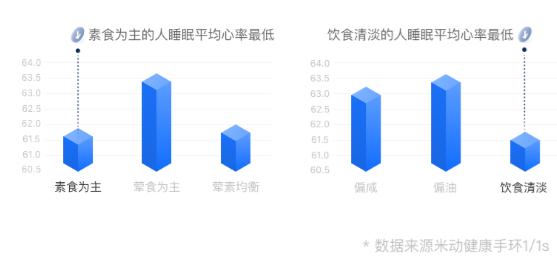 在飲食方面,以葷食為主的人睡眠平均心率最高,而以素食為主的人睡眠平均心率最低,葷素均衡人群的心率則相對處于較低水平。而“重口味”人群需要提高警惕,偏咸、偏油的飲食習(xí)慣均會顯著影響心率水平。