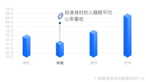 與之相應(yīng),身材越好的人睡眠平均心率也越低;不管偏瘦還是偏胖,這個數(shù)字都會上升,肥胖人群的這個趨勢就更加明顯。數(shù)據(jù)顯示,標(biāo)準(zhǔn)身材的人睡眠平均心率最低為61.9,而肥胖人群的睡眠平均心率則最高達(dá)到65.1,接近危險水平。綜合以上因素,大數(shù)據(jù)建議您,邁開腿、管住嘴、少鹽少油,素食養(yǎng)心。