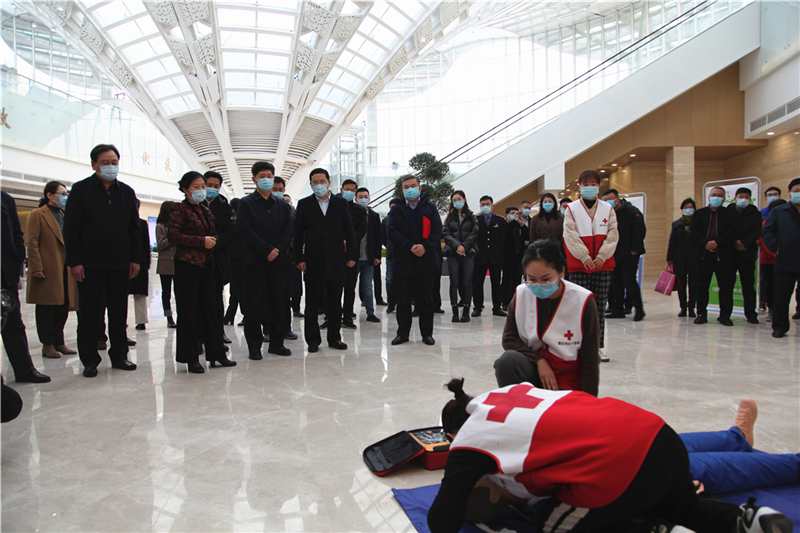 啟動儀式后,領(lǐng)導們參觀了棗莊市民中心健康驛站并觀摩了由紅十字志愿者組織開展的心肺復蘇急救技能培訓。